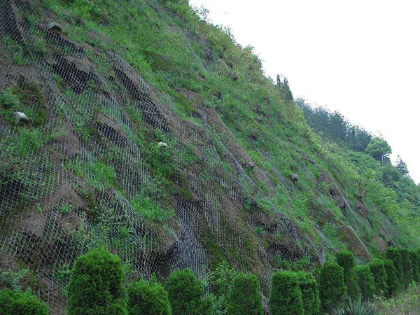 客土噴播掛網是由鋼絲繩網、環形網、固定系統、減壓環和鋼柱四個主要部分構成。鋼柱和鋼絲繩網連接組合構成一個整體,對所防護的區域形成面防護,從而阻止崩塌巖石土體的下墜,起到邊坡防護作用。剛剛提到的S250絞索網就是一種十分有效的形式,降低壓力環的預設和選用使整體體系的沖力獲得進一步進步提高。
